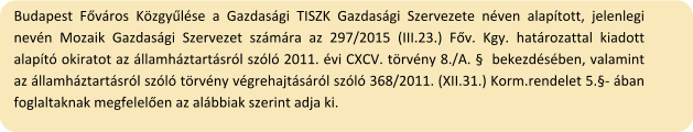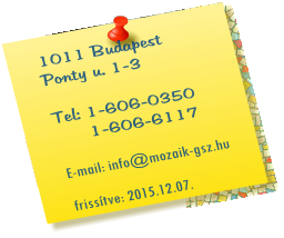 Mozaik Gazdasági SzervezetKözfeladatunk:Az a.) pontban felsorolt köznevelési intézmények tekintetében Magyarország helyi önkormányzatairól szóló 2011. évi CLXXXIX. törvény 13. § (1) bekezdés 6. pontjában meghatározott feladatok gazdasági, pénzügyi, műszaki ellátása.A b.) pontban felsorolt, köznevelési intézmények feladatainak ellátását szolgáló ingó és ingatlan vagyon működtetése a nemzeti köznevelésről szóló 2011. évi CXC. törvény 74. § (4) bekezdése és 76. § (1) és (3) bekezdése szerint, a törvény keretei között kötött szerződésben foglalt módon és feltételekkel.A c.) pontban megnevezett intézmény tekintetében Magyarország helyi önkormányzatairól szóló 2011. évi CLXXXIX törvény 13. § (1) bekezdés 7. pontjában meghatározott feladatok gazdasági, pénzügyi, műszaki ellátásaA Mozaik Gazdasági Szervhez rendelt intézmények és ingatlanok felsorolása:a.)Cseppkő Óvoda (Bp., II. Cseppkő u. 74.)Fővárosi Önkormányzat Óvodája (Bp., VI. Városligeti fasor 30.)b.)Budapest Főváros Önkormányzatának Nyitott Világ Fejlesztő Iskolája (Bp., XII. Diósárok u. 40.)Budapest Főváros Önkormányzatának Hungária Általános Iskolája és Kollégiuma(Bp., XIX. Hungária út 36.)Dr. Szent-Györgyi Albert Általános Iskola; Pedagógiai Szolgáltató Intézet(Bp., III. Szérűskert u. 40.)Horvát Óvoda, Általános Iskola, Gimnázium és Kollégium (Bp., XIV. Kántorné sétány 1-3.)Mérei Ferenc Fővárosi Pedagógiai és Pályaválasztási Tanácsadó Intézet (Bp., VIII. Vas u. 8.)Német Nemzetiségi Gimnázium és Kollégium (Bp., XX. Serény u. 1.)Török Flóris Általános Iskola (Bp., XXIII. Dinnyehegyi köz 2.)Kőbányai Keresztury Dezső Általános Iskola (Bp., X keresztúri út 7-9) •c.)Fővárosi Roma Oktatási és Kulturális Központ (székhelye: Bp., VIII Szentkirályi u. 7. telephelye: Bp., VIII Népszínház u. 31., 8640 Fonyód, Fürdő u. 7.) Speciális feladatunk:-Ellátjuk azon, a Fővárosi Önkormányzat tulajdonát képező, a nemzeti köznevelésről szóló 2011. évi CXC. törvény 74. § (4) bekezdése alapján az állami intézményfenntartó központ általműködtetett ingatlanokon található önkormányzati bérlakások üzemeltetését, amelyeküzemeltetése nem tartozik más költségvetési szerv feladatkörébe.-Ellátjuk a 2012. december 31. napjáig a Fővárosi Önkormányzat fenntartásában működőoktatási és kulturálisintézmények által nyújtott munkáltatói lakáskölcsönök kezelését.Bemutatkozás